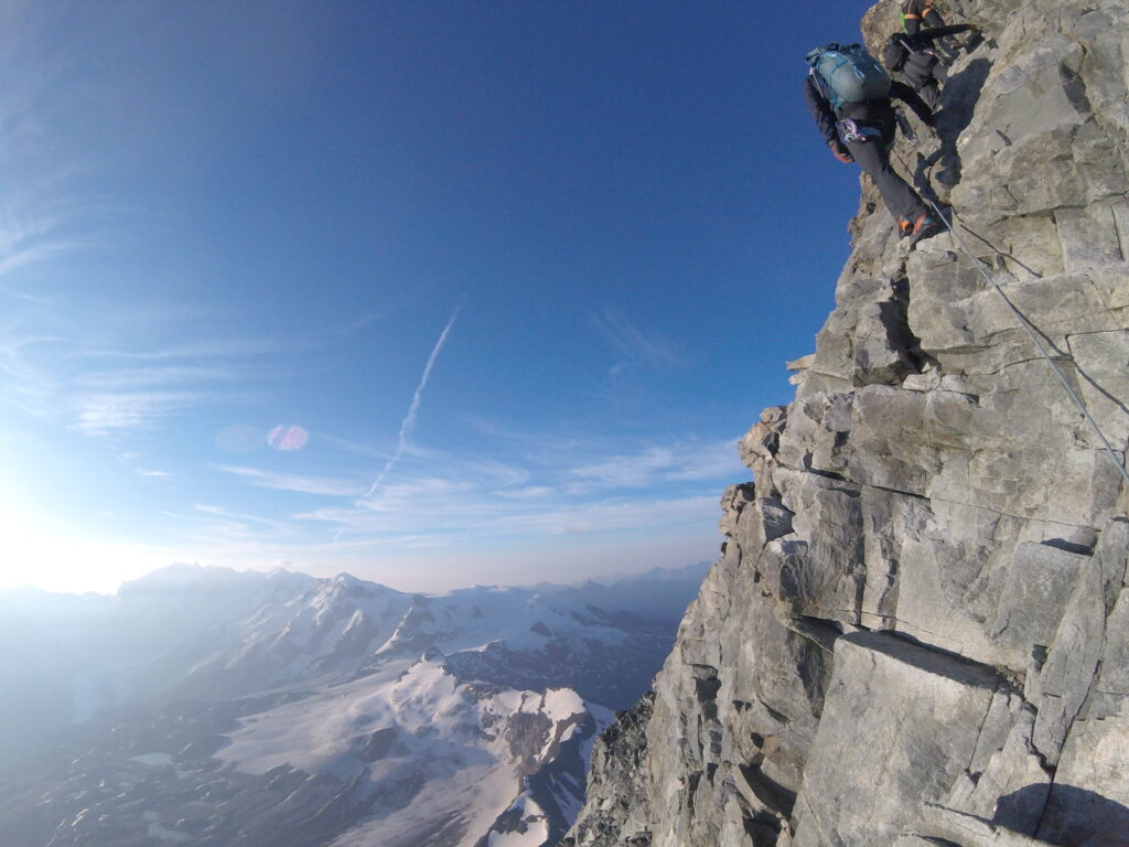 - Day 5 – Walking back across the Valle Blanche in the morning, we then climb the famous Cosmiques Arete. This class alpine ridge line finishes back at the top of the Aig d’Midi, and provides another chance to practice our alpine rock climbing in boots. We will spend the night in Chamonix. In the afternoon we will get our equipment ready for the Matterhorn and go over logistics for traveling to Zermatt.